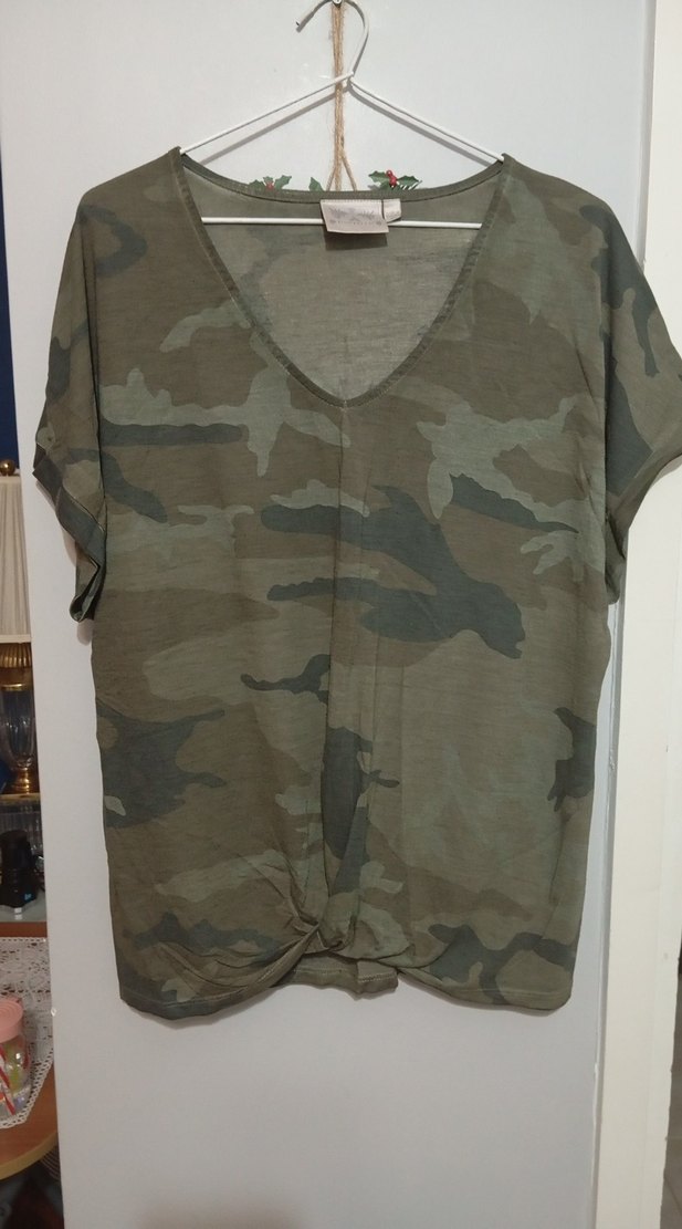 Gri ve haki kamuflaj desenli, V yakalı, kısa kollu, keten kumaştan salaş kesim kadın tişörtü. Dökümlü detaylı ve midi boyda, dış mekan için uygun.