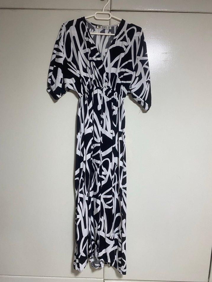 V Yaka Salaş Siyah Beyaz Uzun Elbise