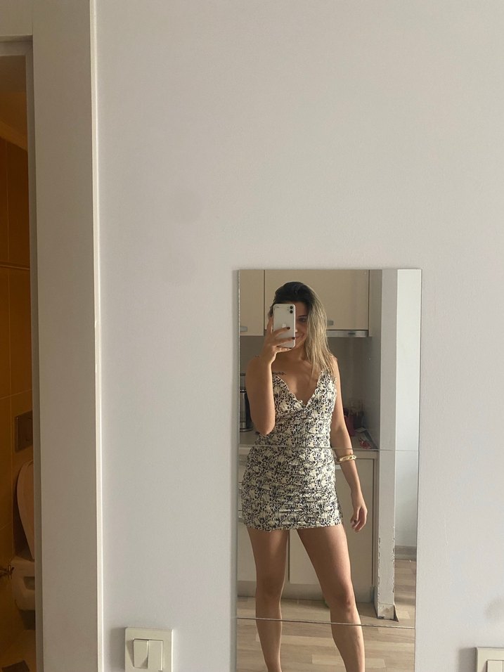 V yaka, şeffaf kumaşlı ve yılan desenli, dar kesim mini elbise. İnce askılı ve minimalist sokak stili, günlük kullanım için uygun gri renkte.
