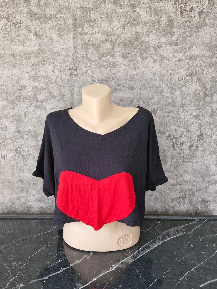 Pamuk siyah crop top, V yaka ve kısa kollu, bol kesim, cesur kırmızı baskılı tasarım ile günlük sokak stili için uygun.