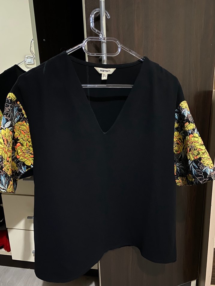 V yakalı, kısa kollu, siyah renkli, baskılı desenli kadın bluz. Salaş ve drapeli kesimiyle normal midi boyda, rahat sokak stiline uygun. hiçbir kusuru yok çok az giyildi pazartesiye kadar kargolayabilirim sonrasında şehir dışında olacağım
