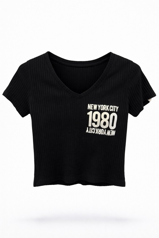 Pamuklu, v yakalı, kısa kollu siyah tişört, '1980 NEW YORK CITY' baskılı. Günlük kullanıma uygun, rahat ve şık görünüm sunar. Kısa krop tarzi