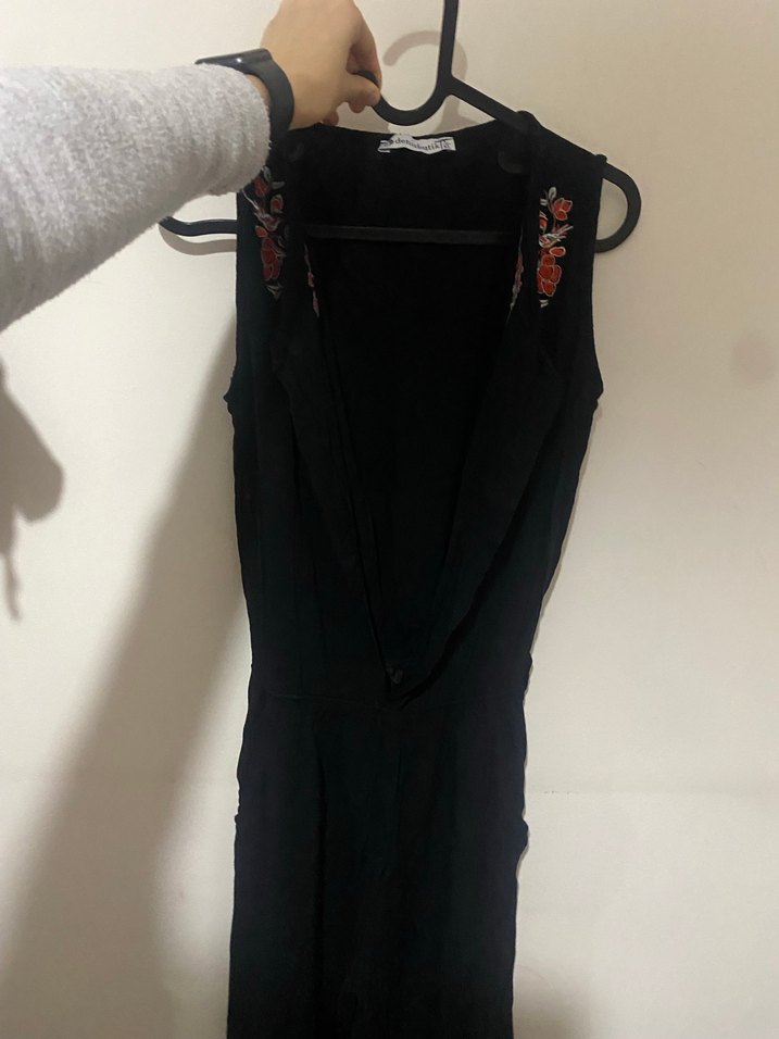 V yaka ve kolsuz tasarıma sahip, baskılı ve dökümlü siyah kadın tulumu. Sentetik kumaştan, romantik akşamlar için uygun.