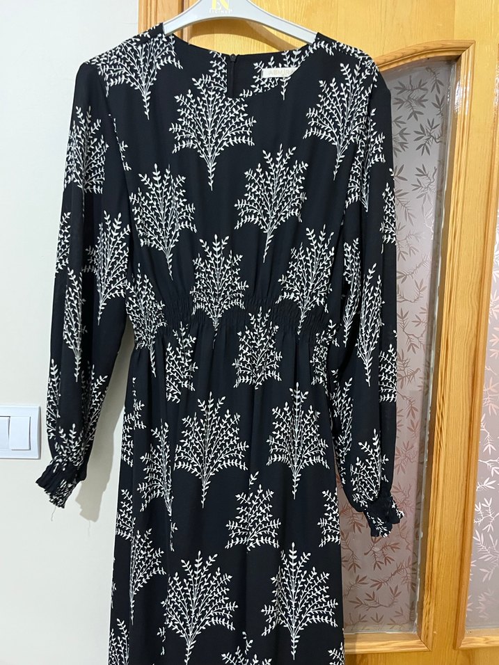 Siyah uzun kollu elbise, V yaka ve salaş kesime sahiptir. Minimalist baskılı deseni ve drapeli stiliyle günlük kullanıma uygundur.