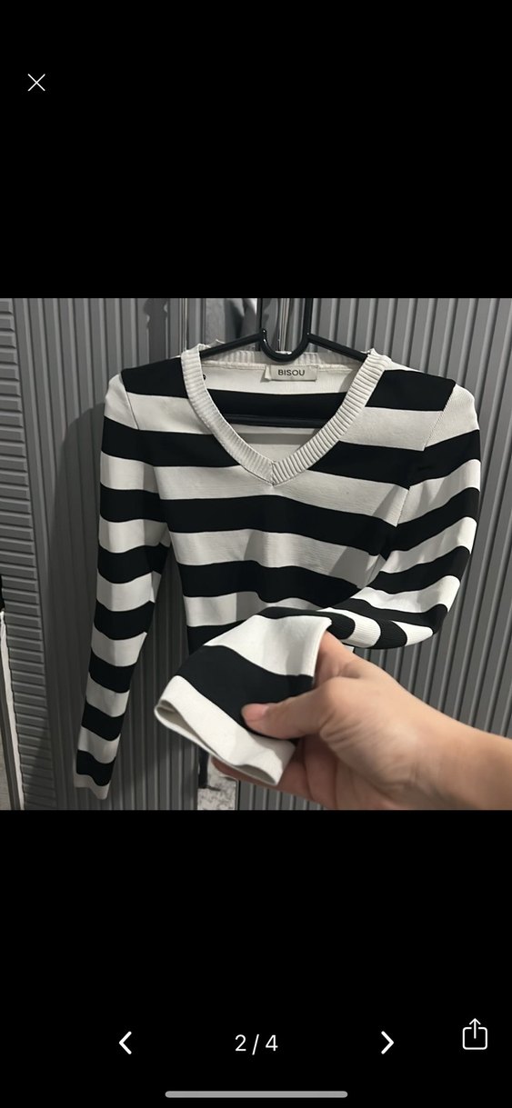 V yaka, uzun kollu, siyah beyaz çizgili, örme dokulu, normal midi boyda, sentetik kumaştan kadın kazak. Trendy casual ve streetwear tarzına uygundur.