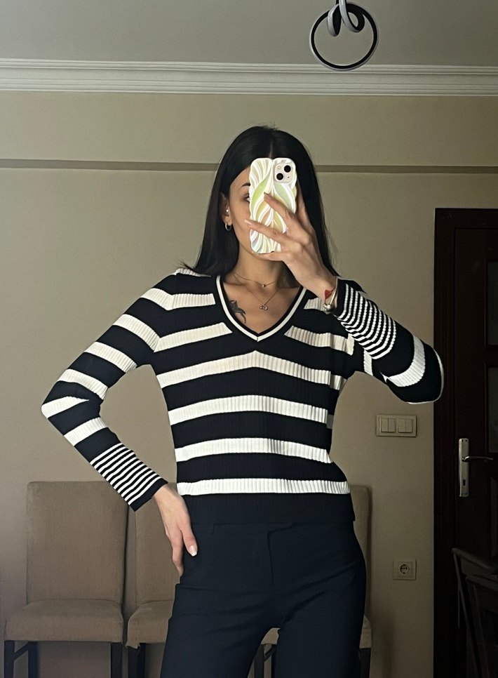 V Yaka Siyah Beyaz Çizgili Kadın Kazak