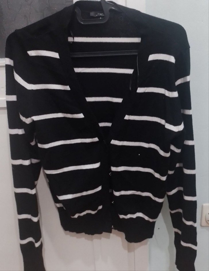 Hiç kullanılmadı S beden likralı v yaka, uzun kollu, siyah beyaz çizgili, triko kumaştan kadın hırka. Günlük rahat sokak stiline uygun, dar kesim.