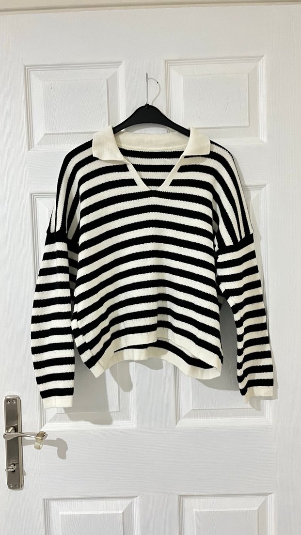 Bu kadın kazağı, uzun kollu ve V yaka tasarımıyla rahat bir kesime sahiptir. Siyah beyaz çizgili yumuşak örgü kumaştan üretilmiş, günlük kullanıma uygun Paris tarzı şık bir üründür.