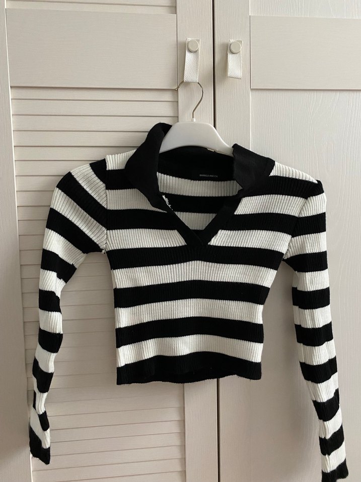 V yaka, uzun kollu, siyah beyaz çizgili triko kazak, dar kesim ve günlük rahat stil sunar.