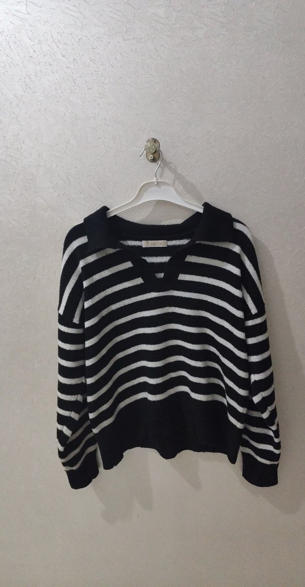 V yaka ve uzun kollu, siyah beyaz çizgili triko kazak, rahat ve günlük kullanım için uygun, bol kesim.