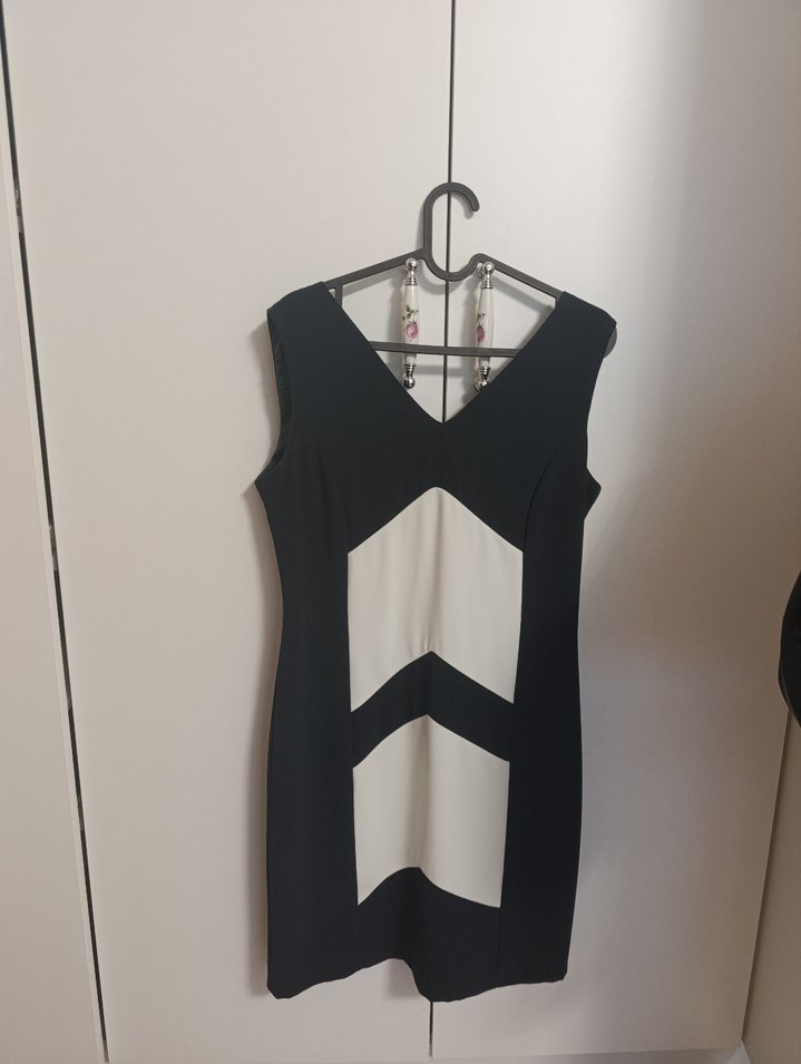 V yaka, kolsuz, siyah beyaz desenli elbise. Midi boyda, şık ve avangart tarz için uygun.