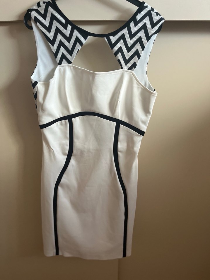 V yaka, kolsuz, vücuda oturan midi elbise. Üst kısmında siyah beyaz zikzak desen ve siyah şerit detaylar bulunur. Sırtında fermuarlı kapanış vardır. Ofis için çağdaş tarzda.