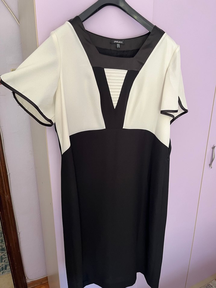 V yaka ve kısa kollu, göğüs kısmında pileli detaylara sahip siyah-beyaz midi elbise, ofis için uygun regular fit sunar. 48 beden 50 bende. Kisiler icin uygundur
