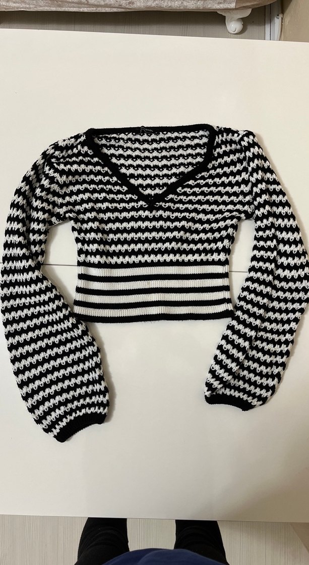 V yaka ve uzun kollu, siyah beyaz çizgili örme triko kazak. Rahat ve şık, günlük sokak modasına uygun.
