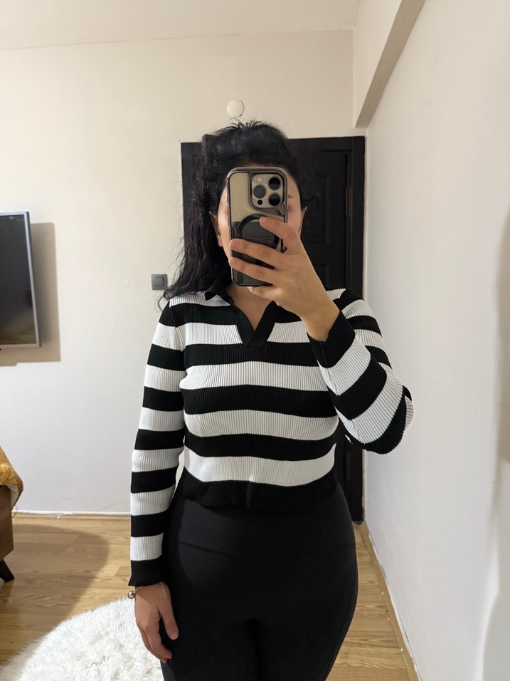 V Yaka Siyah Beyaz Zebra Desenli Triko Kazak