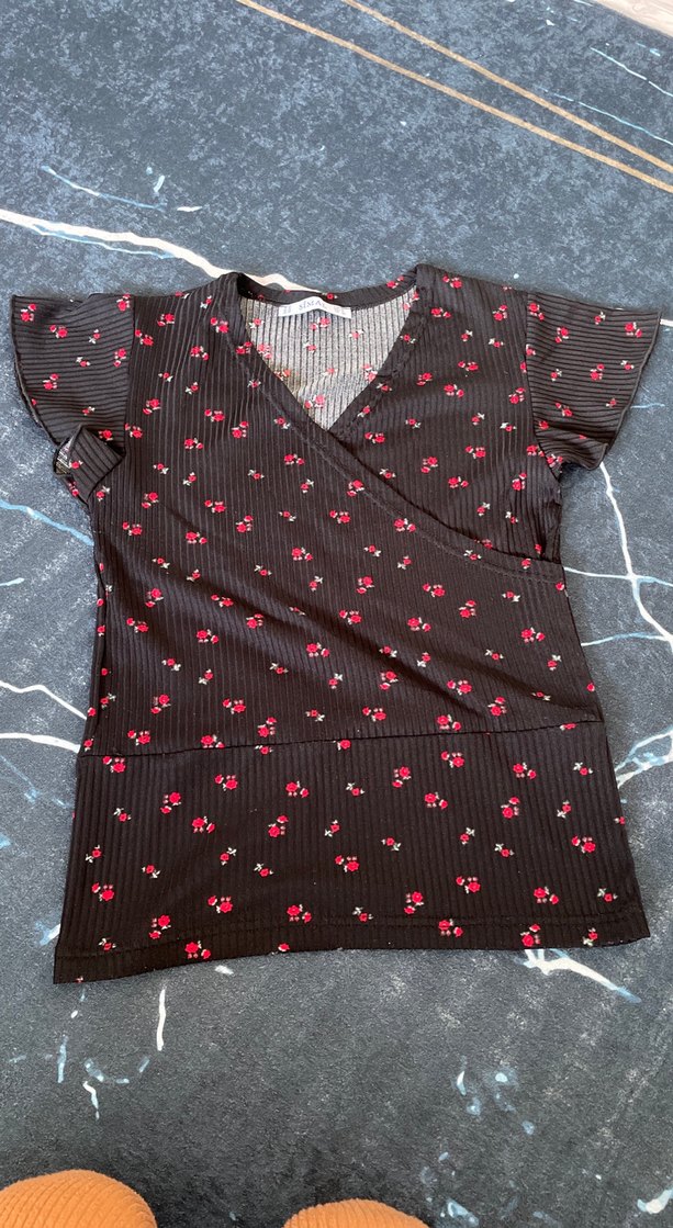 V Yaka Siyah Çiçekli Hamile Tişörtü