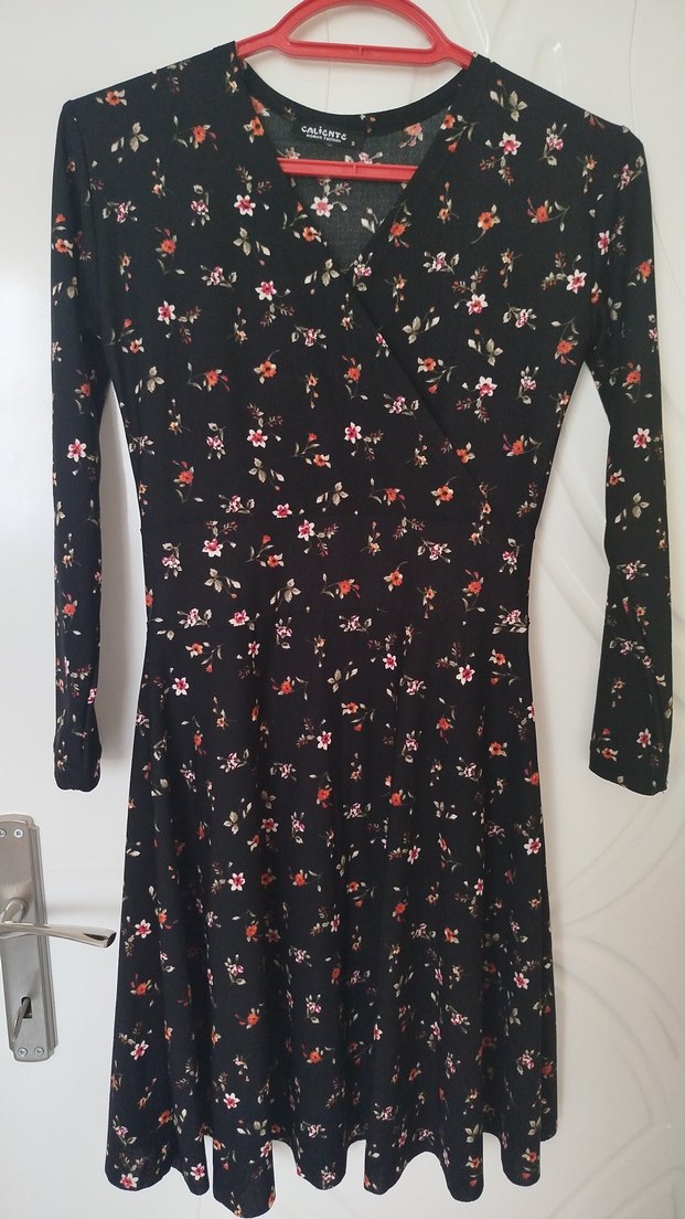V yaka ve uzun kollu, siyah çiçekli vintage desenli, düğmeli, mini boy, vücuda oturan elbise. Günlük kullanıma uygundur.