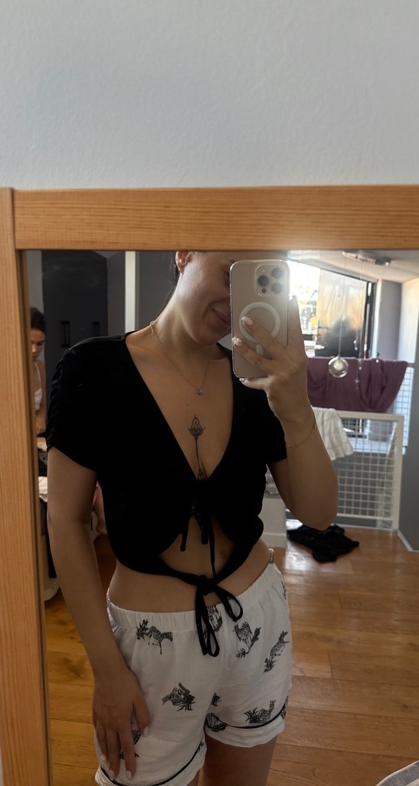 Pamuk kumaştan, V yaka ve kısa kollu, siyah renkli, midi boyda, bağlamalı crop top. Günlük kullanıma uygun, rahat ve şık goth tarzı.