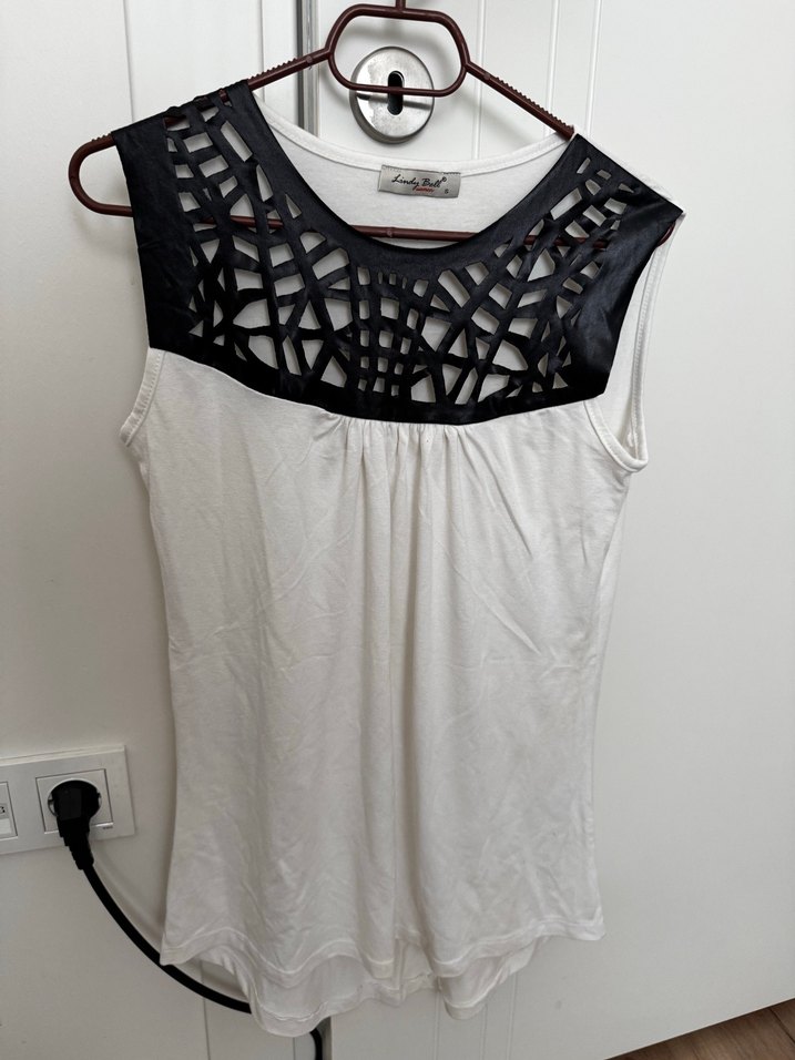 V yaka, siyah dantel detaylı, beyaz, kolsuz, fitted kesim bluz. Gotik ve Parisli avant-garde tarzı yansıtır.
