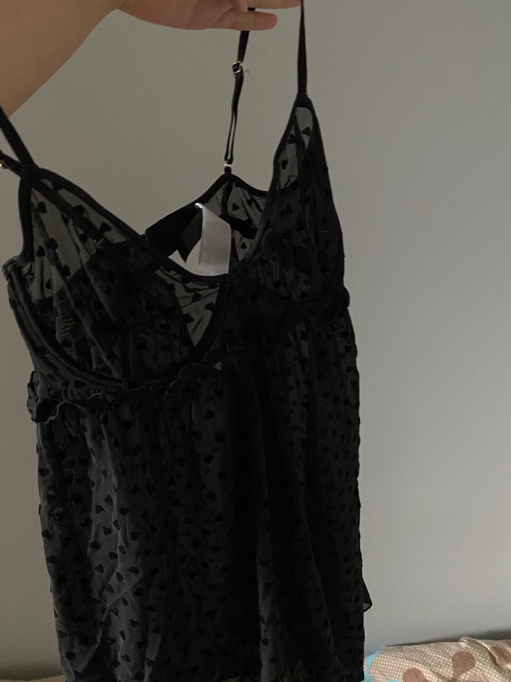 V yakalı, askılı ve dantelli siyah gotik büstiyer, sentetik kumaştan ve vücuda oturan kesimde tasarlanmıştır. geceliktir lcw marka l beden