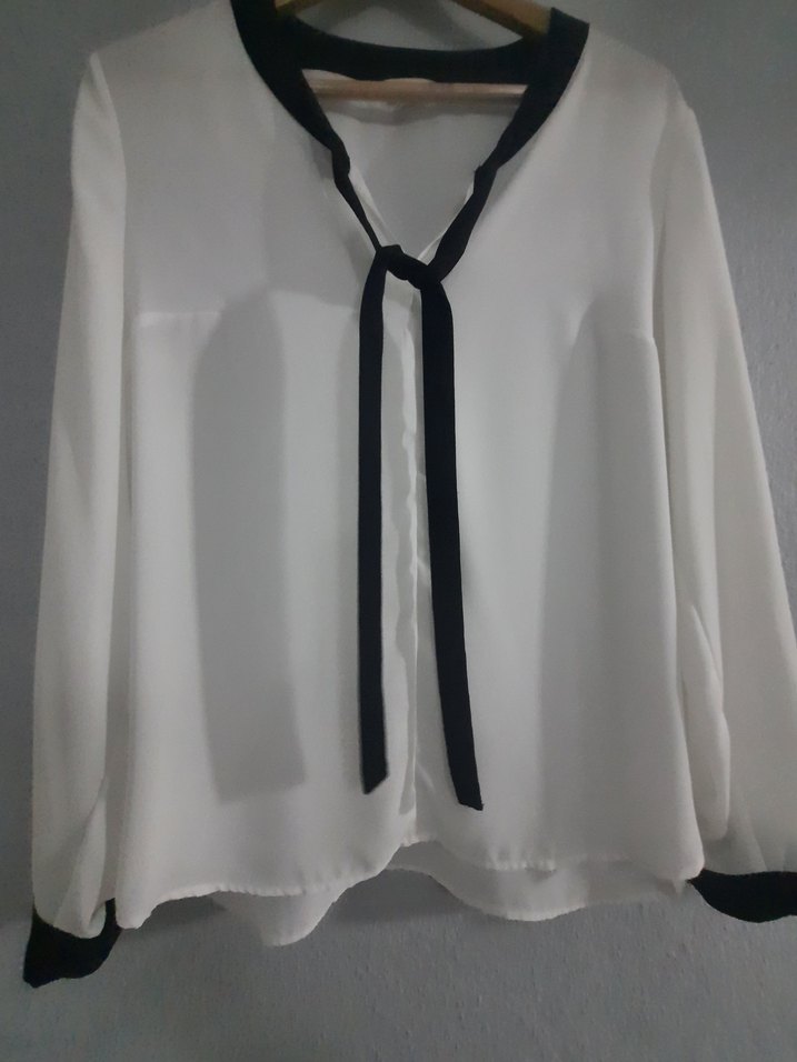 Geniş kesim, şifon kumaşlı kadın gömlek. yuvarlak yaka ve bağlamalı ön kısmı, siyah yakalık ve manşet detaylarıyla ofis için uygundur.