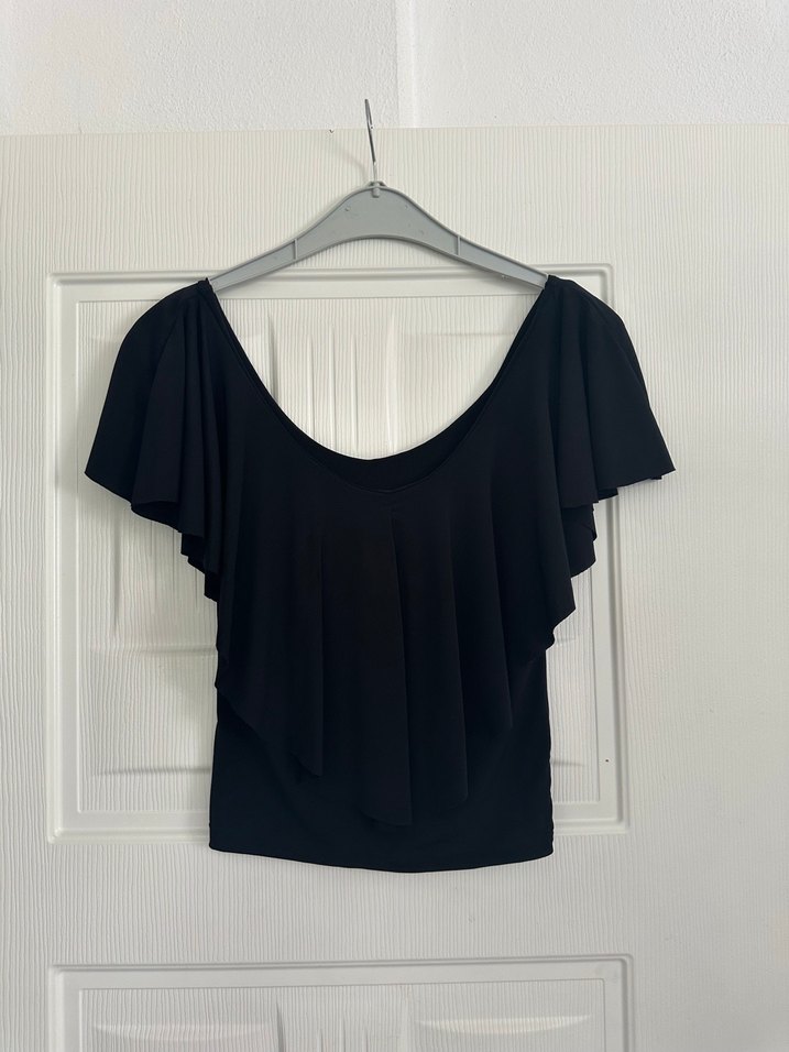 V yaka, drapeli tasarıma sahip siyah, kısa kollu, ince kesim bluz. Yumuşak keten kumaştan üretilmiştir, günlük kullanıma uygundur.