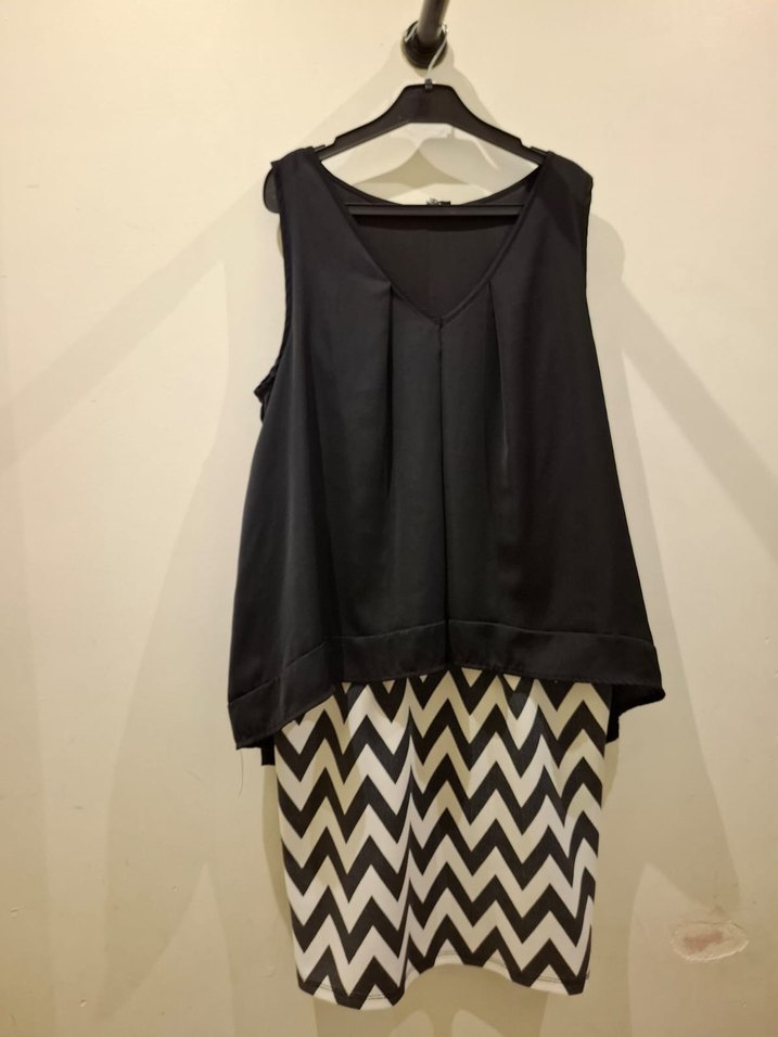 V yakalı, kolsuz, dökümlü detaylı mini elbise. Siyah üst kısmı ve zebra desenli eteğiyle günlük kullanıma ve davetler için uygun modern tarz.