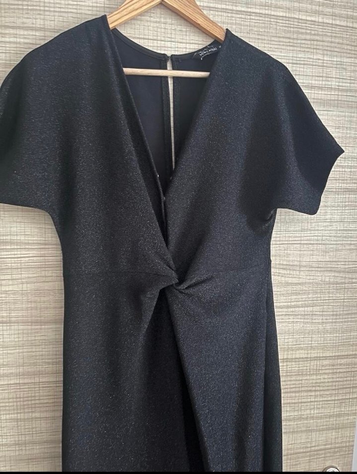 V yakalı, kısa kollu, drapeli siyah uzun elbise, ofis için minimalist ve çağdaş bir tarz sunar. Ürün kumaşı aşırı parlak olmamakla beraber simlidir. Bir kaç kez kullanılmış olup iyi durumdadır