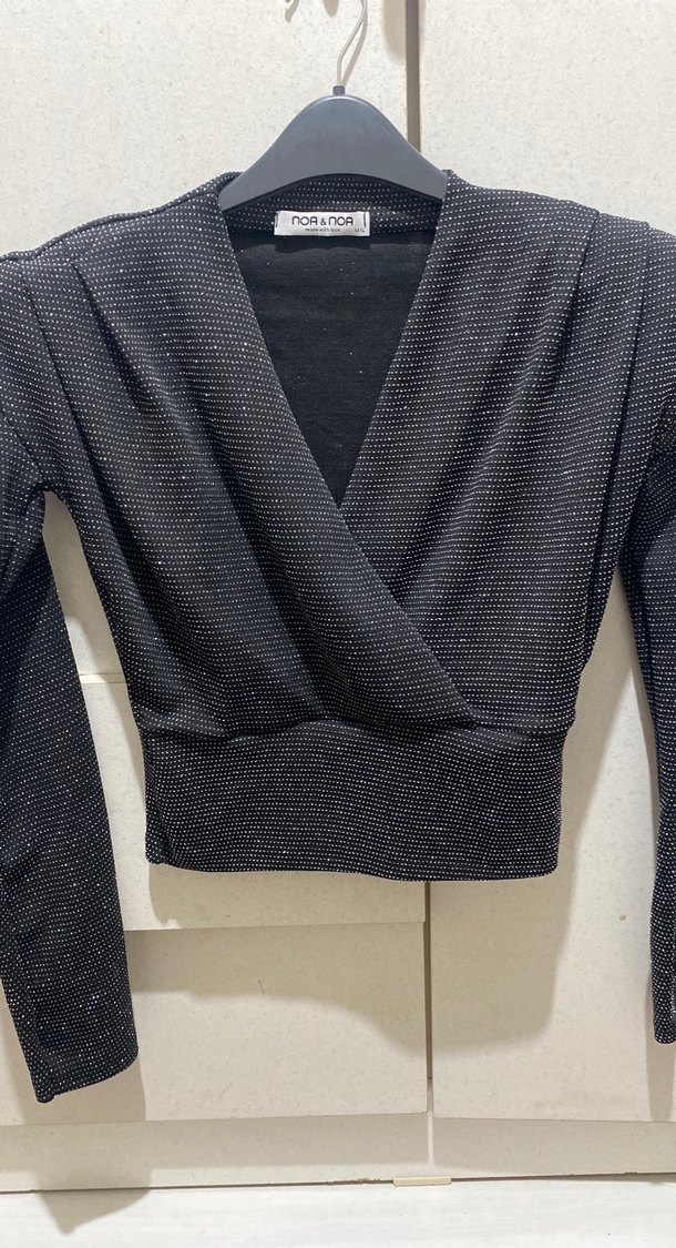 V yaka ve uzun kollu, düğmeli, siyah, sentetik kumaştan yapılmış, orta boy uzunlukta dar kesim kadın bluz. Ofis kullanımı için uygun. Simli kumaşı vardır vatkalı