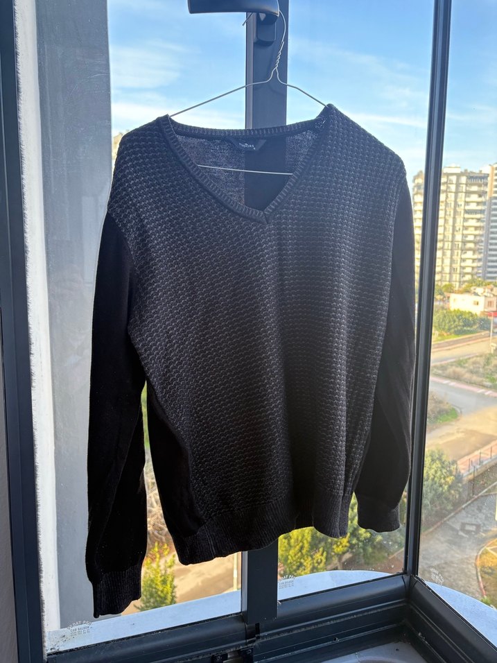 V yakalı, uzun kollu, siyah erkek triko kazak. Örgü dokulu, bol kesim ve günlük kullanım için uygun, sentetik kumaştan üretilmiştir.