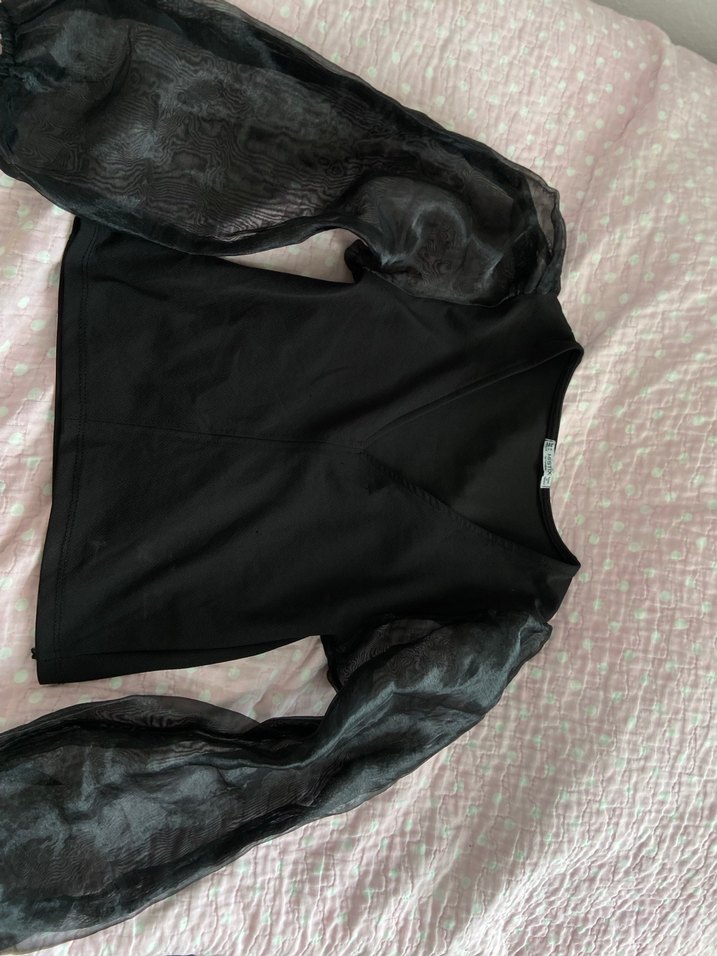 V yaka, şeffaf sentetik kumaştan drapeli uzun kollu, siyah, fitted gotik tarzda midi uzunlukta kadın bluz.