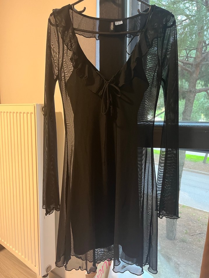 V yaka, drapeli ve askılı kollara sahip siyah, vücuda oturan midi elbise. Şeffaf uzun kolları ile gotik ve modern bir tarz sunar.