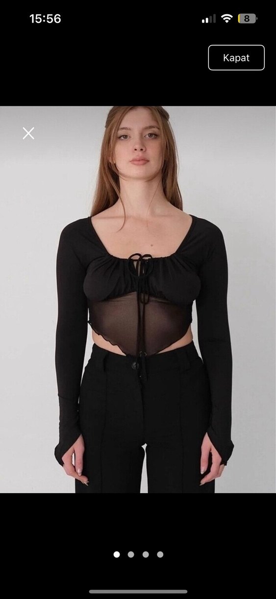 V yaka, uzun kollu, siyah gotik mini bluz. Sentetik kumaştan, şeffaf detaylı ve vücuda oturan kesimle dikkat çekiyor.