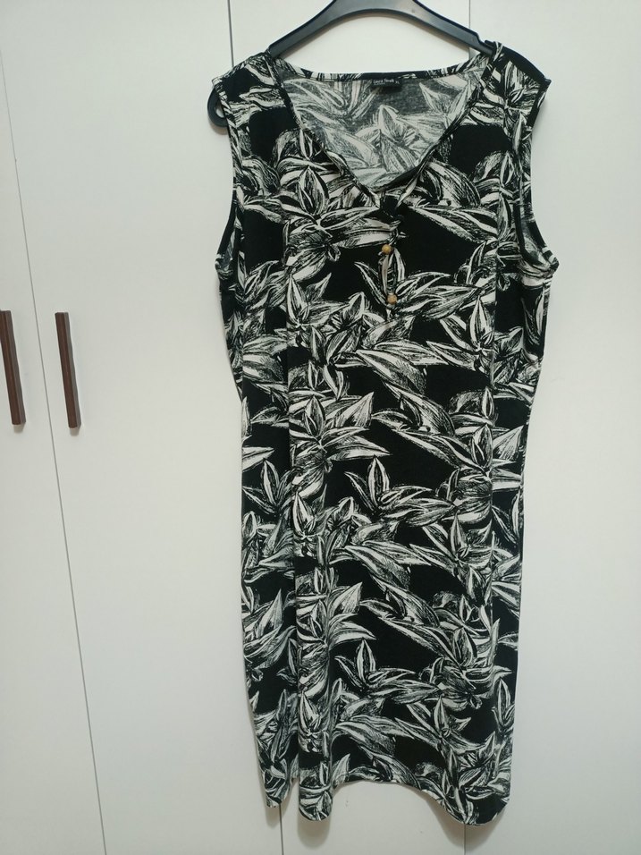 V yaka, kolsuz, siyah ve gri baskılı midi elbise, bol kesim ve drapeli detaylı, sentetik kumaştan günlük kullanım için uygun.