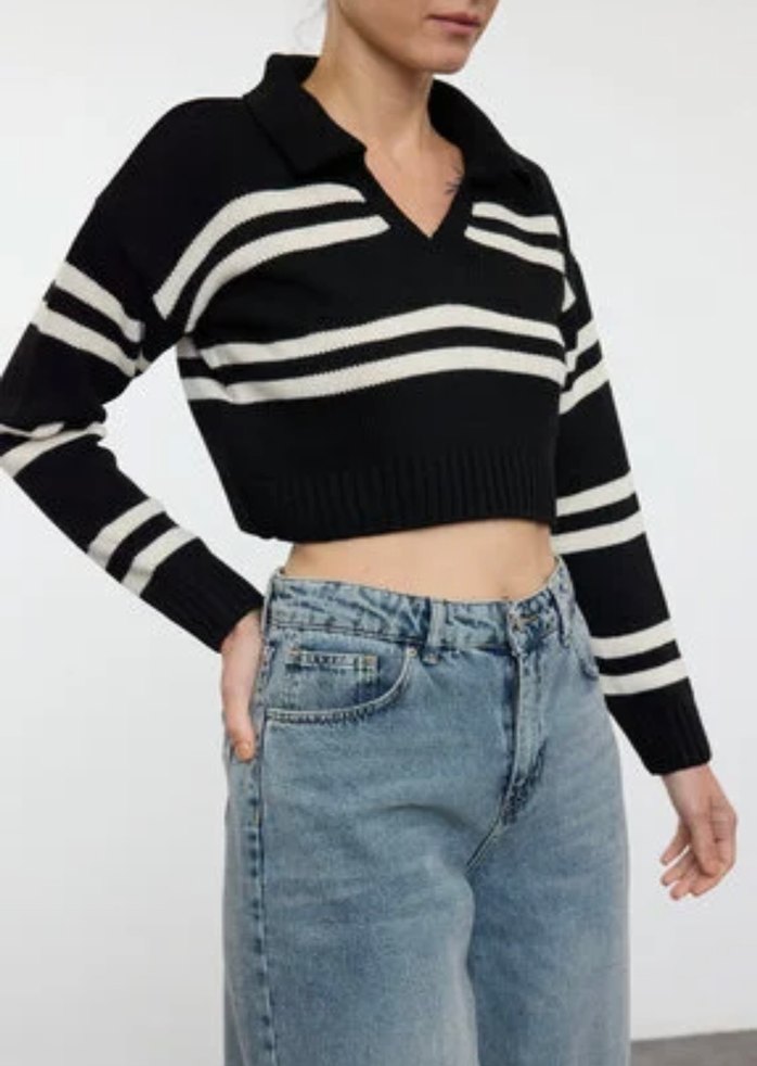 V yakalı, uzun kollu, bol kesim kadın triko kazak. Siyah ve gri çizgili, denim görünümlü örme kumaştan, günlük rahat sokak stili için uygun.