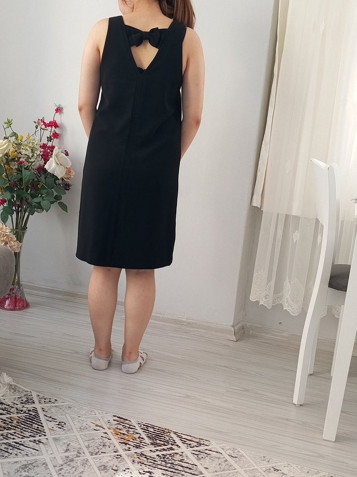 V yaka, kolsuz siyah midi hamile elbisesi, düz kesim ve sentetik kumaştan. Minimalist tasarıma, arkada fiyonk detayıyla ofis kullanımı için uygun.