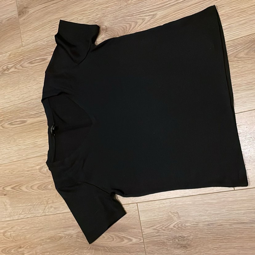 V yaka ve kısa kollu, normal midi uzunlukta siyah hamile tişörtü. Düz, sade tasarımı ve sentetik kumaşıyla günlük kullanıma uygun minimal bir parça.