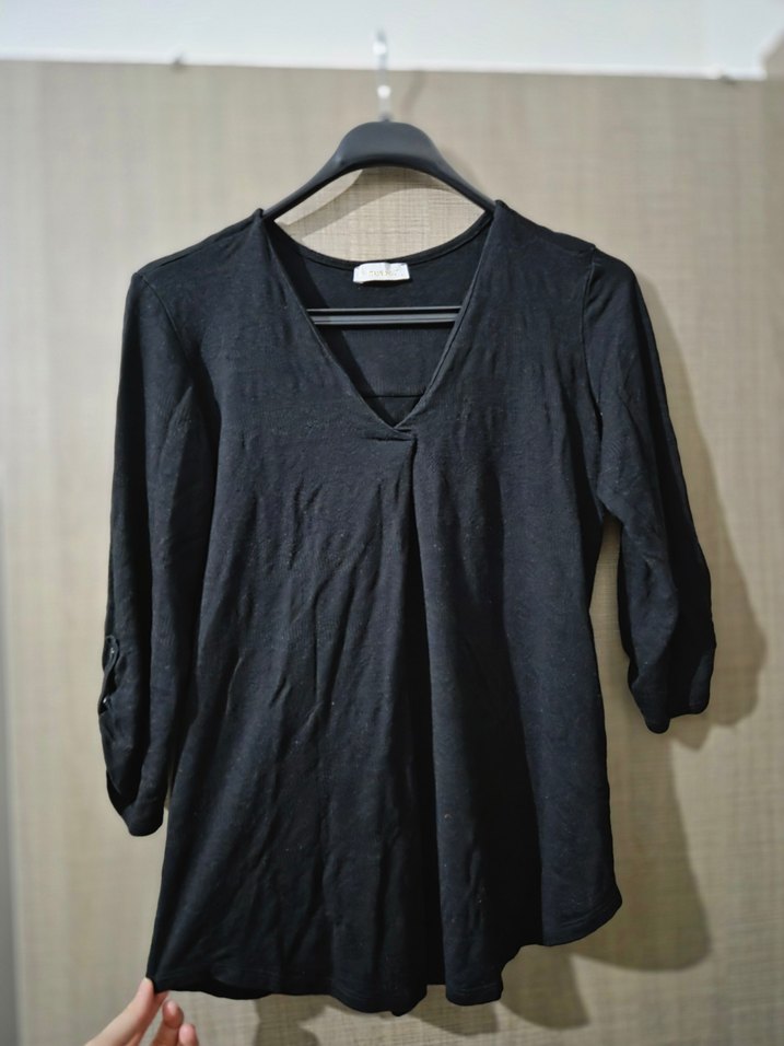 V yaka ve uzun kollu siyah bluz, bol kesimiyle minimalist ve zahmetsiz şıklık sunar. Yumuşak penye siyah badi Busem marka L beden Kolları kapri ve düğmeli Defosu yoktur
