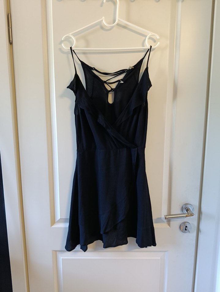 İp askılı, V yakalı, drapeli ve saten dokulu siyah mini elbise, romantik akşamlar için ideal. Bir defa kullanım beden s