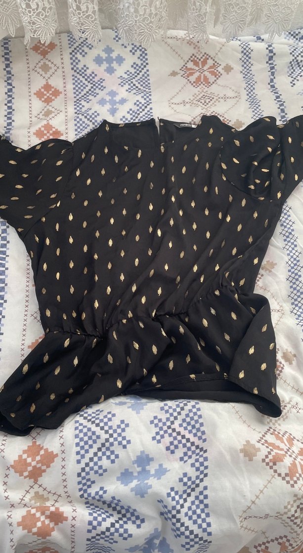 kısa kollu, fırfırlı siyah kadın bluz. Rahat kesim ve ipeksi kumaş, ince desen detaylı, sokak modasına uygun.