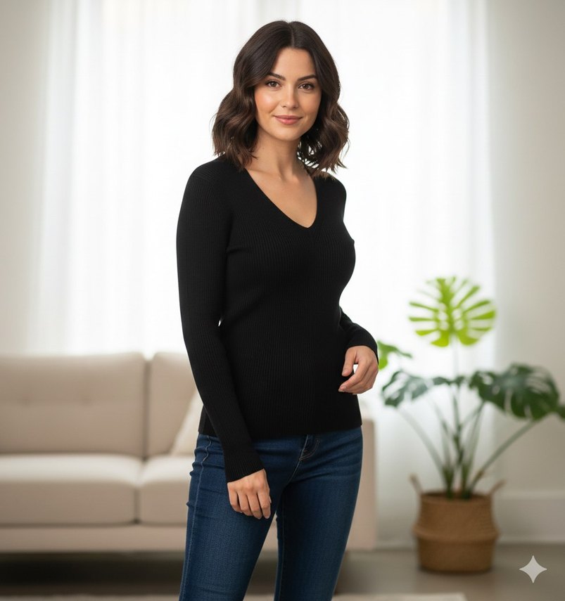 V Yaka Siyah Kadın fitilli basic Triko Kazak