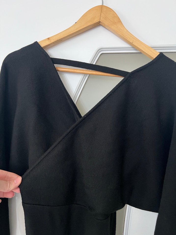 V yakalı, uzun kollu, siyah kadın triko elbise. Drapeli detaylı, modern ve minimalist tarzda, yumuşak sentetik kumaştan yapılmıştır. Midi boy, günlük kullanım için uygundur.