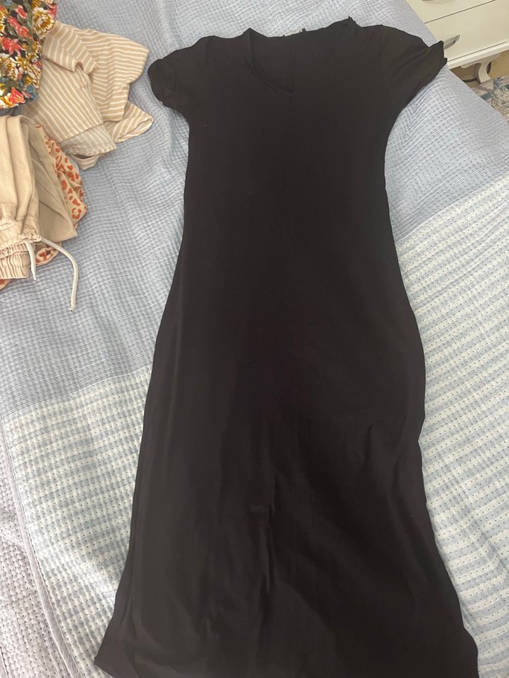 Siyah uzun elbise, v yaka ve kısa kollu, vücuda oturan kesimlidir. Pürüzsüz sentetik kumaştan, drapeli tasarıma sahiptir. Bi kaç kez giydim önünde bi beyazlık var çok az belli
