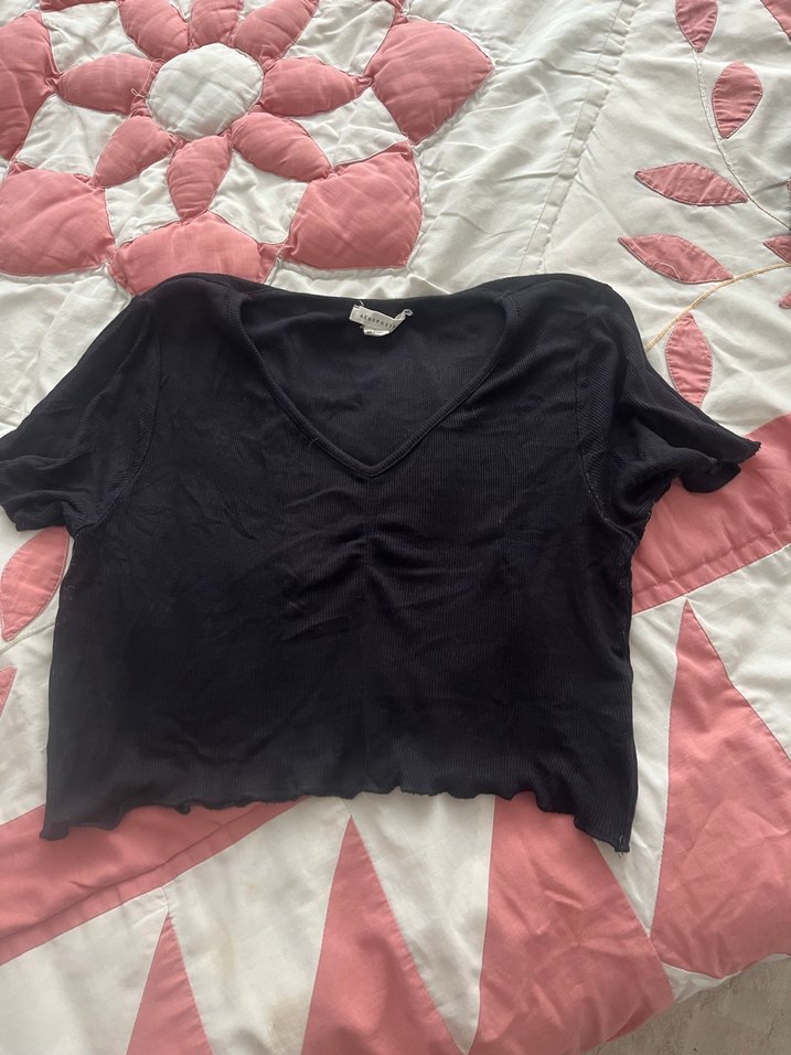 Siyah, V yaka, kısa kollu ve ince keten kumaştan yapılmış, vücuda oturan hamile üstü. Minimalist ve zahmetsiz şıklık sunar, günlük kullanıma uygundur.