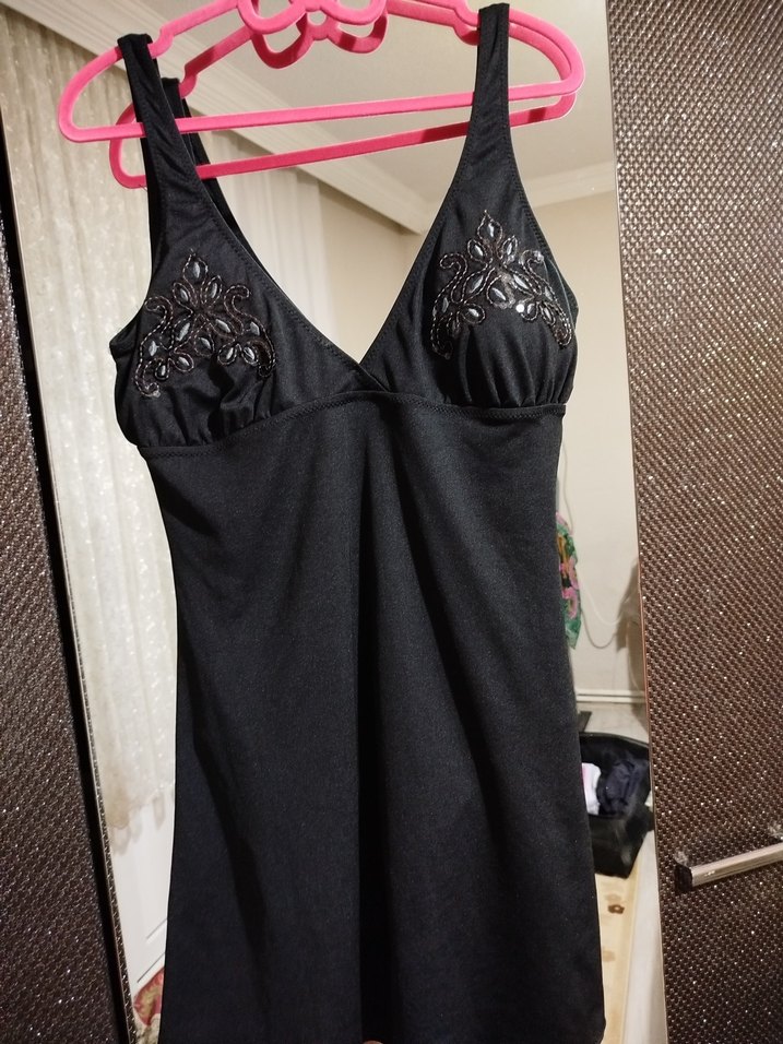 V yaka, kolsuz, normal boy midi mayo . Göğüs kısmında zarif süslemeler bulunur.
