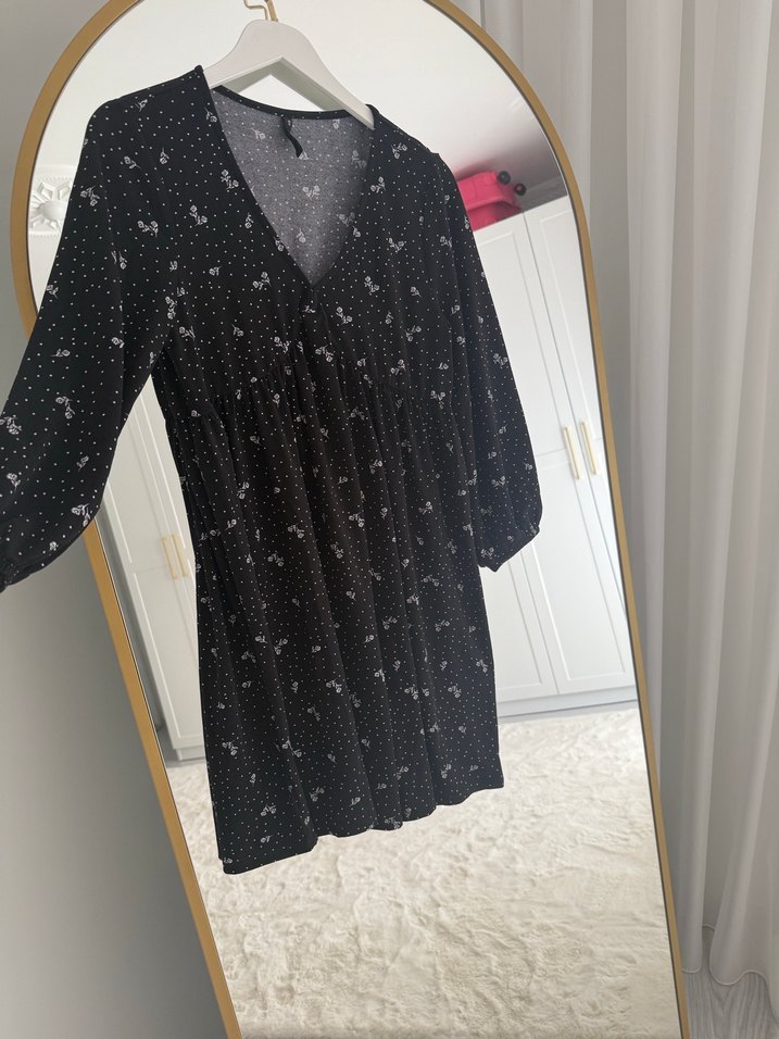 V yaka, uzun kollu,desenli siyah midi elbise, bol kesimiyle rahat bir görünüm sunar. Hamilelerde tercih edebilir. Bol elbise bedeni-Xs-S