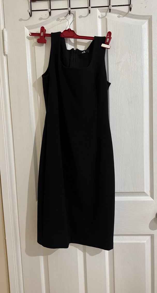 Siyah midi elbise, kolsuz ve V yakalıdır. Drapeli detaylarıyla klasik ve gotik tarzı birleştirir, iş ortamı için uygundur.