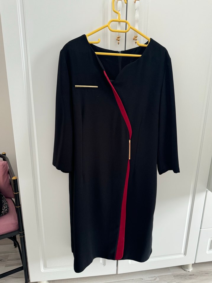 Siyah midi elbise V yaka ve fakir kolludur. Krep kumaştan yapılmış, regular fit ve yırtmaç detayı vardır. Ofis için uygundur.