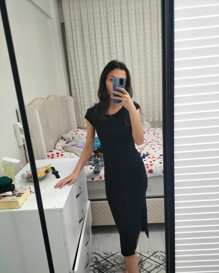 V yaka ve kısa kollu, siyah midi elbise. Düz ve minimalist tasarımı, günlük kullanım için rahat ve şık bir görünüm sunar.