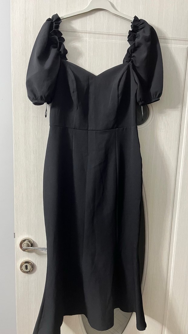 V yaka ve askılı kol detaylı, drapeli siyah midi elbise. Gotik tarzıyla cesur ve şık, ofis için uygun.